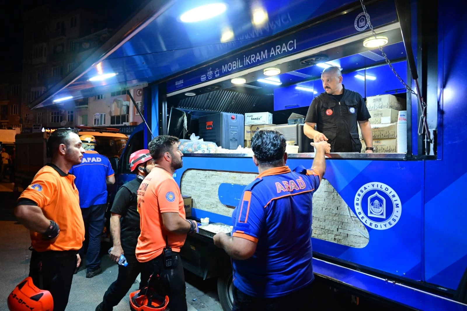 BURSA (İGFA) - Yıldırım Belediyesi Arama Kurtarma Ekibi, AFAD koordinasyonunda yürütülen çalışmalara katılarak, yıkılan binanın enkazındaki depremzedeleri kurtarmak için seferber oldu. Ayrıca Yıldırım Belediyesi Sosyal Destek Hizmetleri Müdürlüğü de bölgeye bir adet mobil ikram aracı ve personel sevk ederek, afetzede vatandaşlara çorba, sandviç, çay ve su ikramı yaptı.