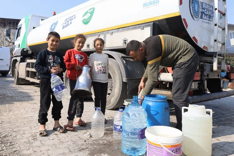 Hatay’da peş peşe gelen depremlerle kentin altyapısının kullanılamaz hale gelmesi yüzünden içme ve kullanma suyu en önemli ihtiyaçlardan biri. Bursa Büyükşehir Belediyesi de Tarım Peyzaj A.Ş marifetiyle gün boyu tankerlerle su taşıyıp, afetzedelerin kullanma suyu ihtiyacını karşılıyor.