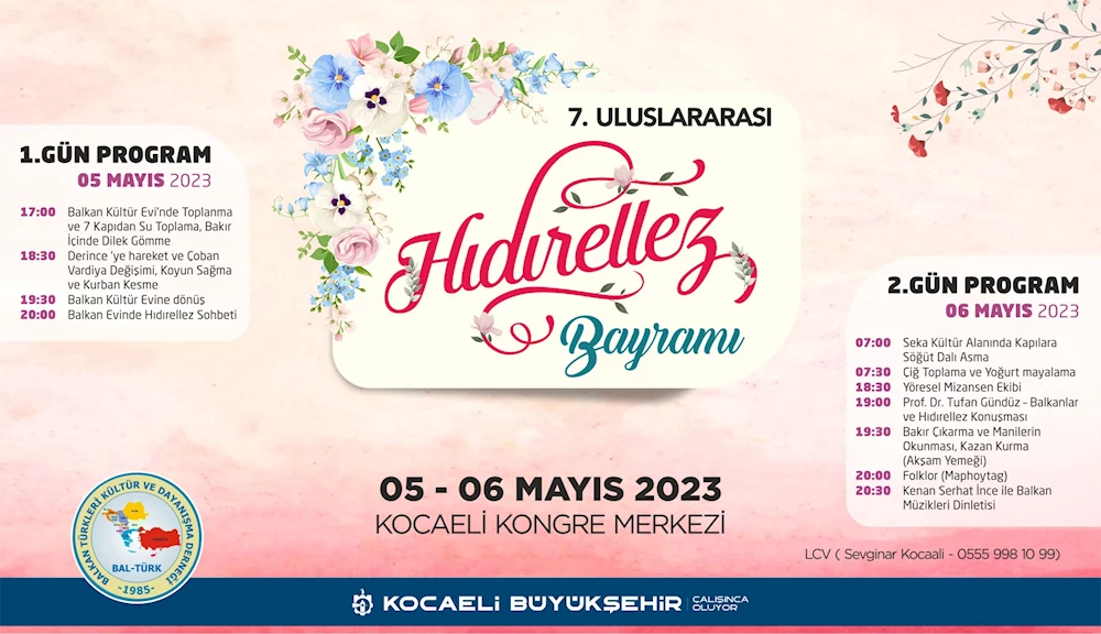 Büyükşehir Belediyesi ile Balkan Türkleri Kültür ve Dayanışma Derneği ile ortaklaşa düzenlenecek olan 7. Uluslararası Hıdırellez Bayramı, 05-06 Mayıs tarihlerinde gerçekleştirilecek. Bayramın birinci günü 17.00’de Seka alanı içindeki Balkan Kültür Evi’nde bir araya gelinerek, yedi kapıdan su toplanacak. Toplanan sular bakır içine konulacak ve bakır gömme ritüeli gerçekleştirilecek. Ardından Derince’ye hareket edilerek burada Çoban Vardiya Değişimi, Koyun Sağma gelenekleri gerçekleştirilecek ve kurban kesilecek. Hıdırellez heyeti etkinliklerin ardından Balkan Evi’ne dönerek, 20.00’de başlayacak Hıdırellez Sohbetine katılacak.