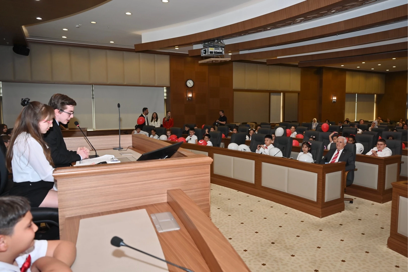 BURSA (İGFA) - 23 Nisan Ulusal Egemenlik ve Çocuk Bayramı ile TBMM’nin açılışının yıl dönümü kutlamaları kapsamında ‘Bursa Büyükşehir Belediye Meclisi Çocuk Oturumu’ Başkan Bozbey’in katılımıyla gerçekleşti. Bursa Büyükşehir Belediye Başkanı Mustafa Bozbey’in koltuğuna oturan Bursa Kent Konseyi Çocuk Meclisi Başkanı Yağız Vatansever ve Çocuk Meclisi yürütme kurulu üyesi İnci Bade Yiğit, çocuklar adına oturum başlangıç konuşmasını gerçekleştirdi.