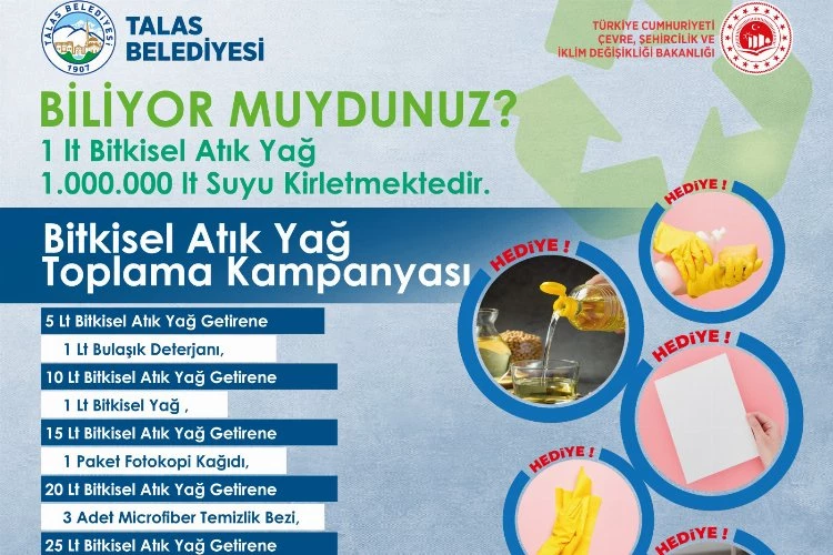 Talas Belediyesi tarafından başlatılan kampanya ile 5 litre bitkisel atık yağ getirene 1 litre bulaşık deterjanı, 10 litre bitkisel atık yağ getirene 1 litre bitkisel yağ, 15 litre bitkisel atık yağ getirene 1 paket fotokopi kağıdı, 20 litre bitkisel atık yağ getirene 3 adet mikrofiber temizlik bezi ve 25 litre atık yağ getirene 5 litre yüzey temizleyici hediye edilecek.