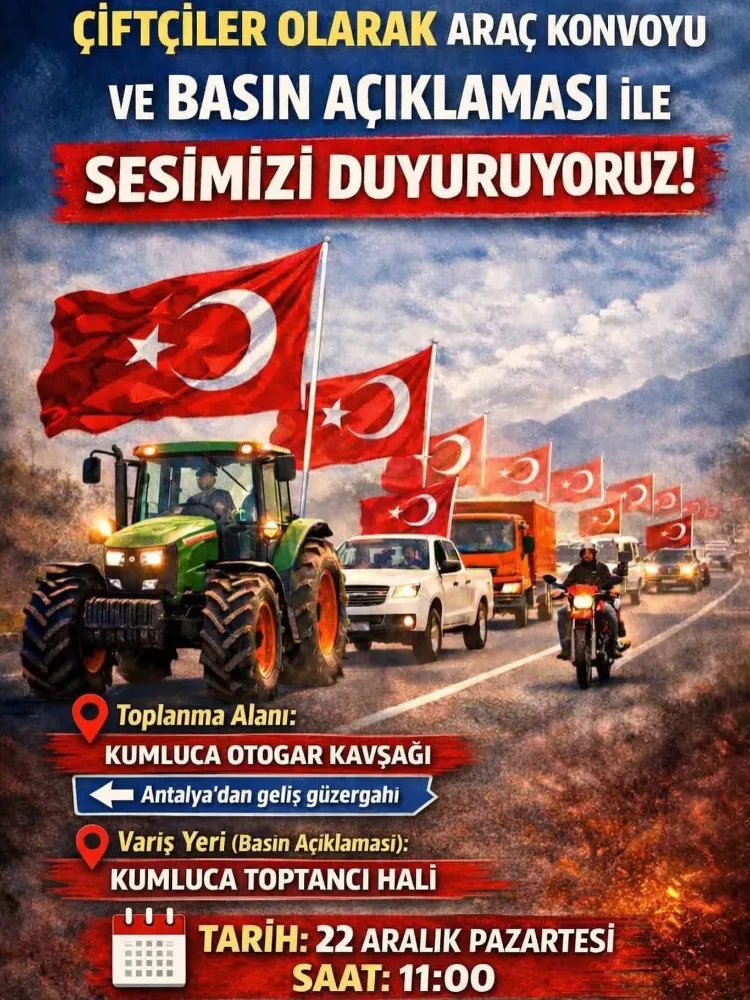Çiftçiler, 22 Aralık Pazartesi günü saat 11.00’de Kumluca Otogar Kavşağı’nda toplanarak, araç konvoyu oluşturacak. Konvoyun ardından üreticiler, Kumluca Toptancı Hali’nde basın açıklaması yaparak taleplerini kamuoyuyla paylaşacak.