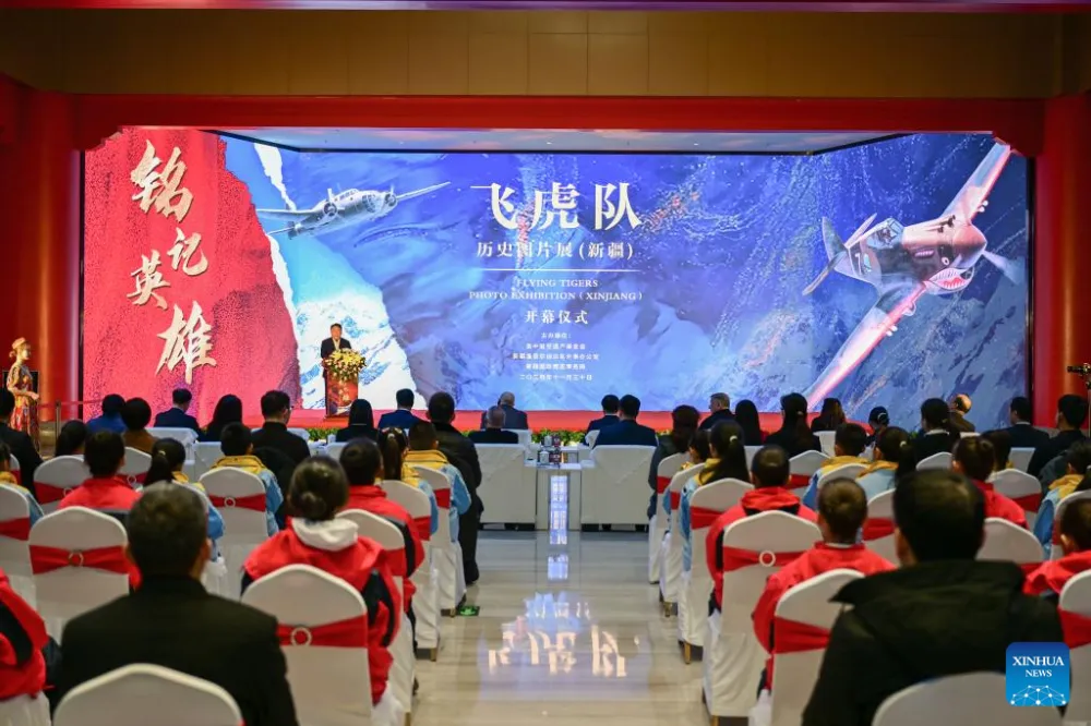 Çin-Amerikan Havacılık Mirası Vakfı heyeti, 30 Kasım 2024'te kuzeybatı Çin'in Sincan Uygur Özerk Bölgesi'nin başkenti Urumqi'de Uçan Kaplanlar'a adanmış bir fotoğraf sergisini ziyaret ediyor. Resmen Çin Hava Kuvvetleri'nin Amerikan Gönüllü Grubu olarak bilinen Uçan Kaplanlar, 1941'de ABD Generali Claire Lee Chennault tarafından kuruldu. Çin halkına işgalci Japon birlikleriyle savaşmada yardım etmek için Çin'e geldiler. (Xinhua/Ding Lei)