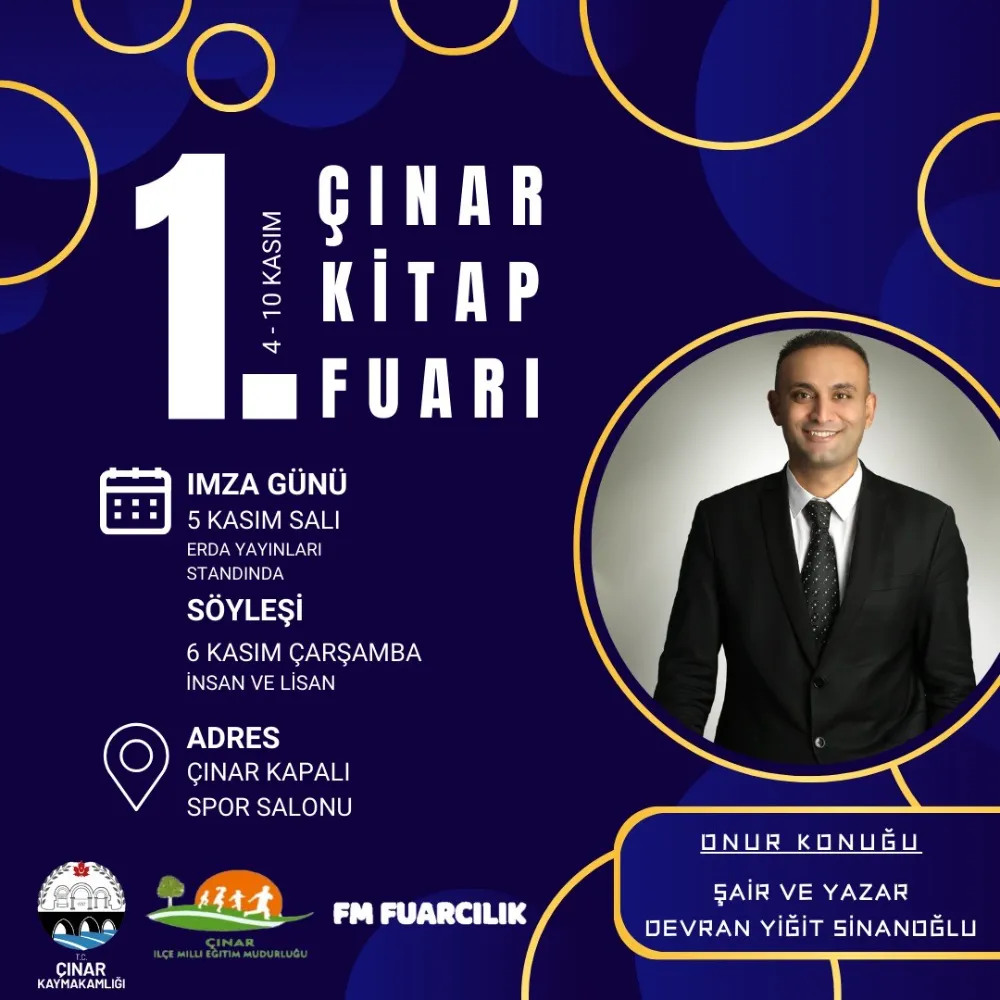 1. Çınar Kitap Fuarında şair ve yazar Devran Sinanoğlu "Onur Konuğu" olarak yer alacak.