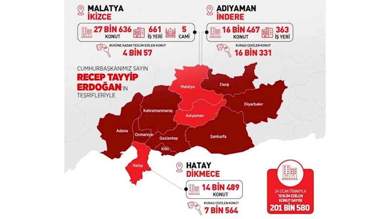 Cumhurbaşkanı Erdoğan, bugün Malatya ile birlikte diğer deprem bölgelerinde de 46 bin 307 bağımsız bölümün hak sahiplerine teslim edileceğini duyurdu.