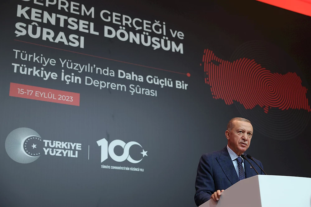 Deprem Gerçeği ve Kentsel Dönüşüm Şurası'nda konuşan Cumhurbaşkanı Recep Tayyip Erdoğan, 'İnsanlarımızı ve şehirlerimizi tehdit eden deprem gerçeğine karşı rantın değil insanın ön planda olduğu şehircilik anlayışından en küçük taviz vermeden deprem bölgelerinden başlayarak 81 ilimizin tamamının çehresini kentsel dönüşümle değiştirmekte kararlıyız.' dedi.
