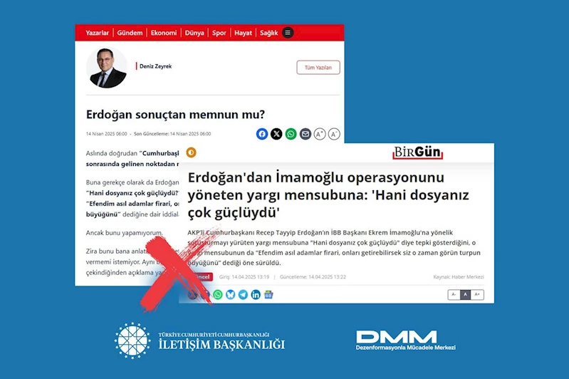 DMM'den yapılan açıklamada, "İBB’ye yönelik yolsuzluk soruşturmasıyla ilgili bazı basın yayın organlarında yer alan, “Cumhurbaşkanı Erdoğan bir yargı mensubunu arayıp, ‘hani dosyanız çok güçlüydü’ dedi şeklindeki iddialar doğru değildir." denildi.