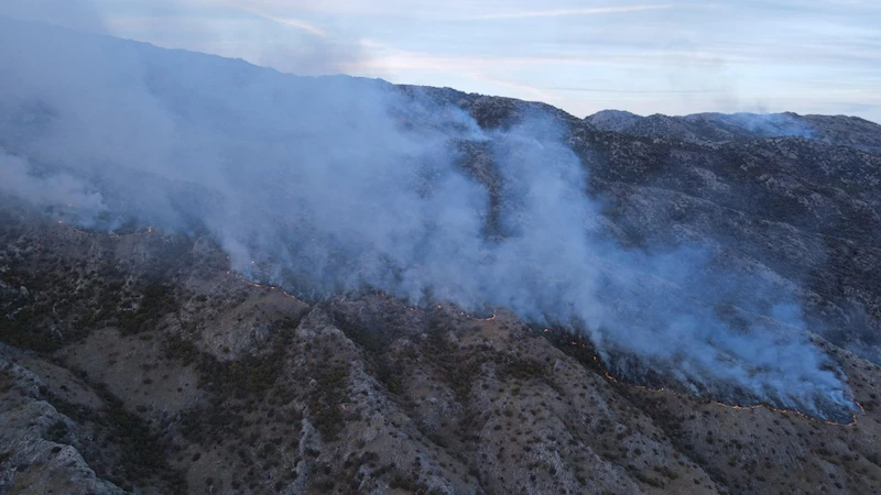 Dağlık, sarp alanda arazi yapısıyla dikkati çeken bölgeye karayolu ila yangına müdahale etmek imkansız görünüyor.
