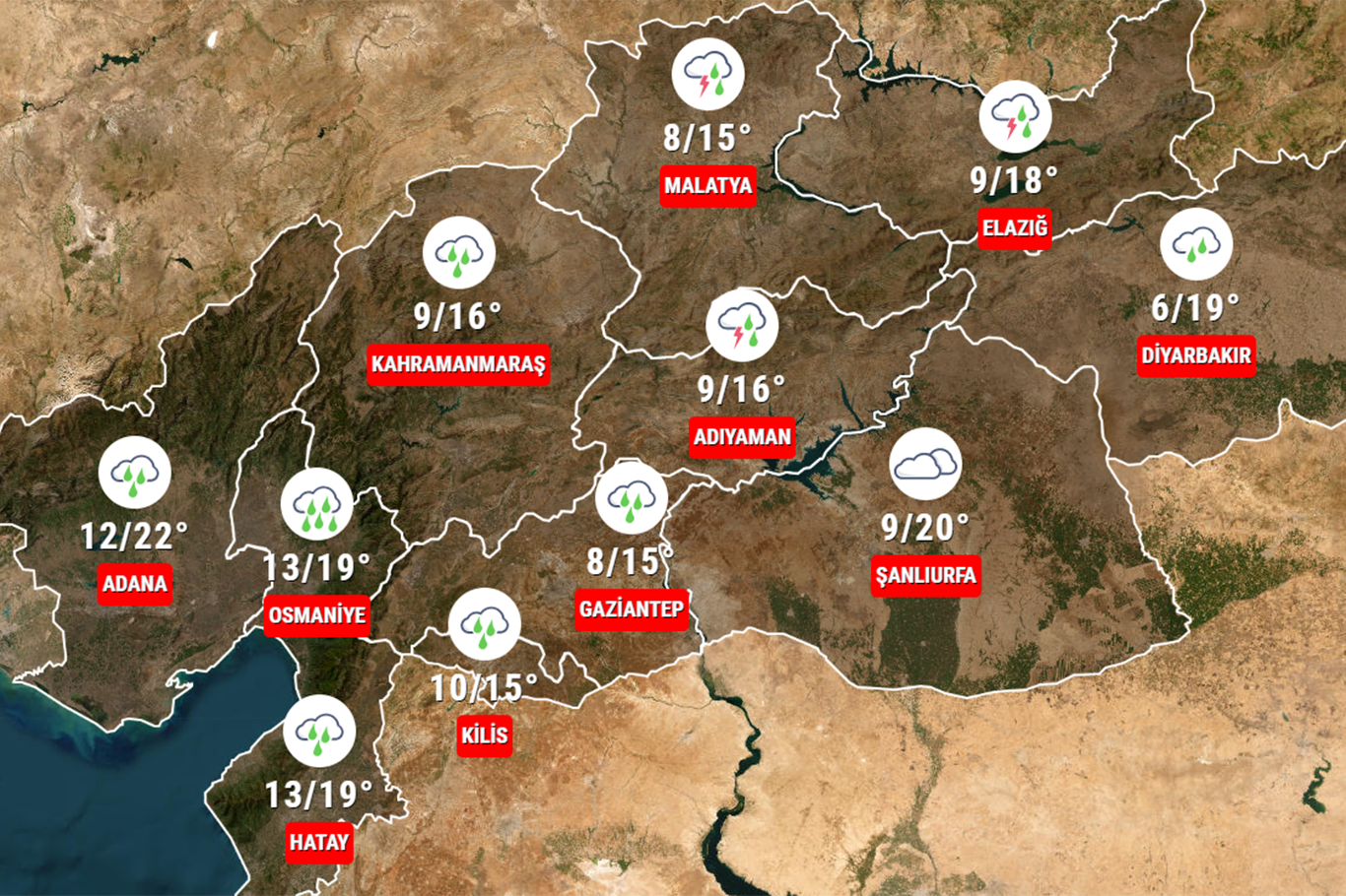 Yapılan son değerlendirmelere göre ülke genelinin parçalı ve çok bulutlu, Marmara, Ege, Akdeniz, İç Anadolu, Karadeniz, Doğu Anadolu'nun kuzey ve batısı ile Bitlis, Gaziantep, Kilis, Siirt, Adıyaman ve Diyarbakır çevrelerinin yağmur ve sağnak, yer yer göklere çıkması sağnak yağışlı geçeceği tahmin ediliyor. Yağışların; Kıyı Ege, İstanbul, Kocaeli, Sakarya, Yalova, Balıkesir, Çanakkale, Bursa, Manisa, Denizli, Uşak ve Osmaniye çevreleri ile Kahramanmaraş'ın batı ilçeleri, Adana'nın kuzeyi ve Hatay'ın hüküm sürdüğü yerel olmak üzere kuvvetli olması bekleniyor. Hava sıcaklıklarının batı kesimlerinde gösterimle birlikte 2 ila 4 derece azalacağı, diğer yerlerde önemli bir değişiklik olmayacağı, genellikle mevsim normalleri üzerinde seyredeceği tahmin ediliyor. Güneydoğu Anadolu'da tozun taşınması bekleniyor. Doğu Karadeniz'in iç kesimleri ile Doğu Anadolu'nun yükselişi ve yüksek dağ çığlarında Koruma riski bulunuyor. Kuvvetli uyarı uyarısı: Yağışların; Kıyı Ege, İstanbul, Kocaeli, Sakarya, Yalova, Balıkesir, Çanakkale, Bursa, Manisa, Denizli, Uşak ve Osmaniye çevreleri ile Kahramanmaraş'ın batı ilçeleri, Adana'nın kuzeyi ve Hatay'ın hakimiyetinde yerel olmak üzere kuvvetli olması beklendiğinden ani sel, su baskını, yıldırım, yerel dolu yağışı ve sağanak şiddetli rüzgar gibi olumsuzluklara karşı dikkatli ve tedbirli olunması gerekiyor.