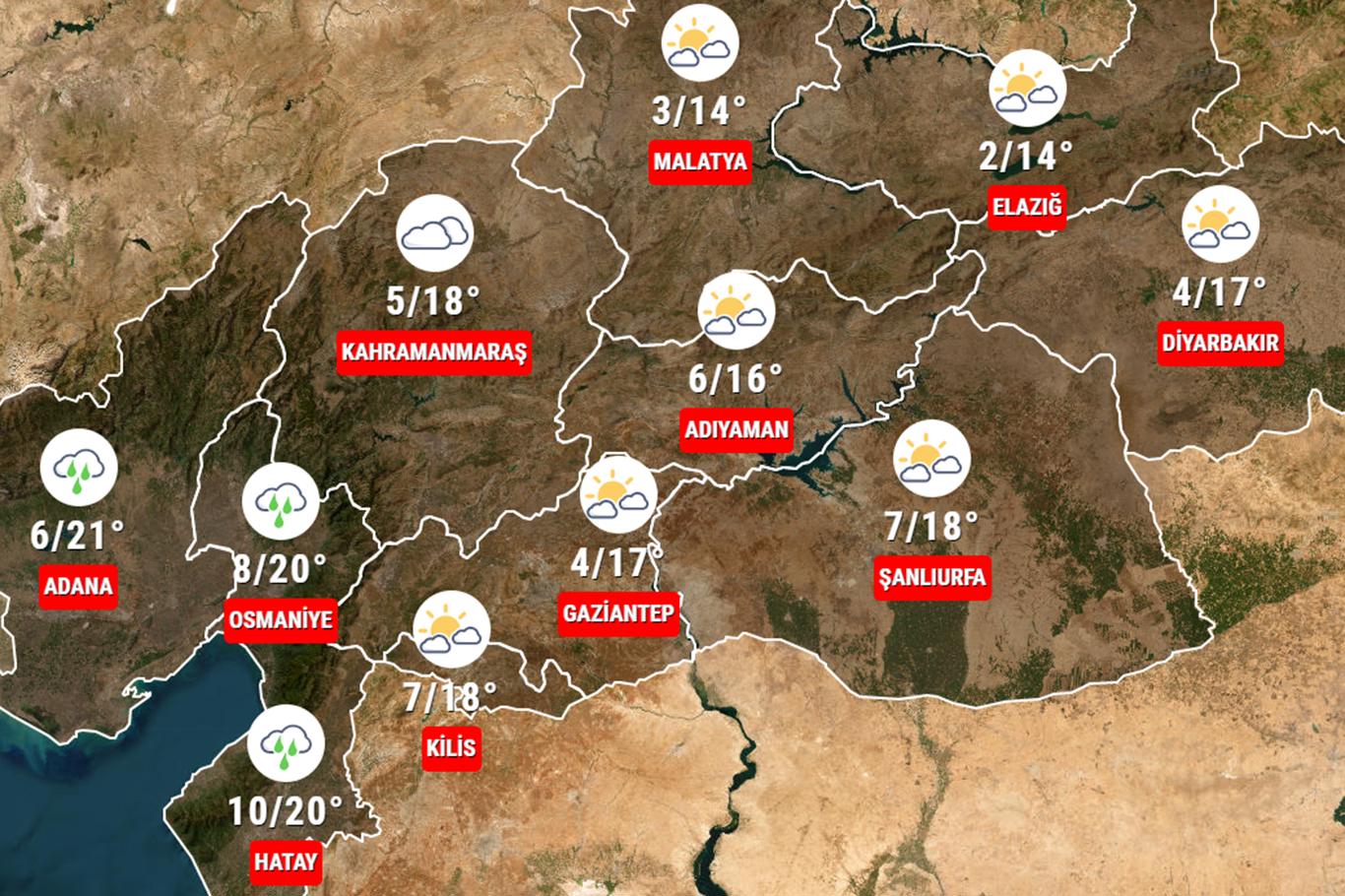 Meteoroloji'den alınan son bilgilere göre depremden etkisi Adana, Osmaniye ve Hatay'da bugün yağmurlu bir hava bekleniyor.