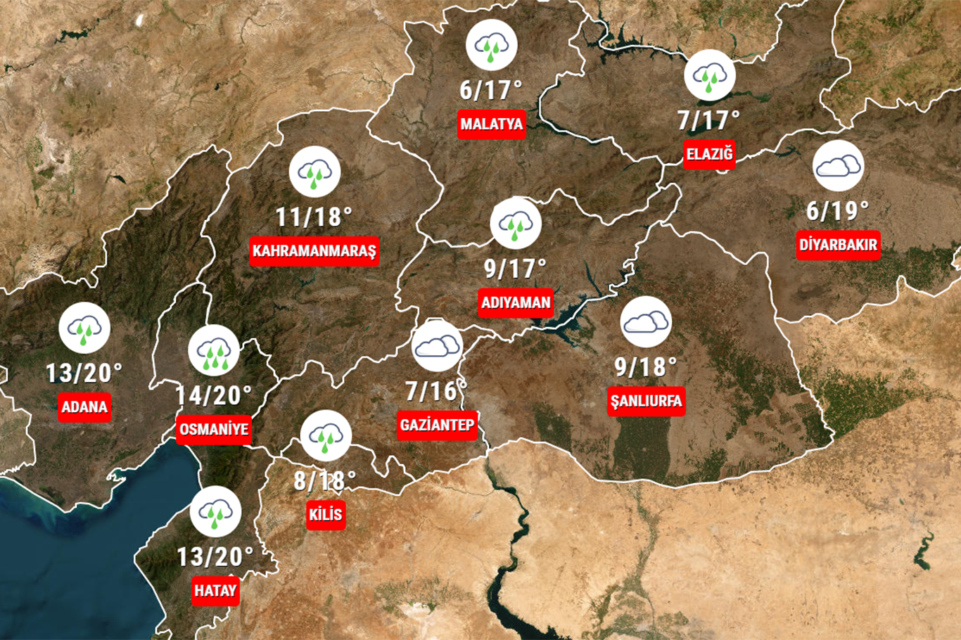 Yapılan son değerlendirmelere göre, deprem bölgesi genelinin bugün parçalı ve çok bulutlu, Malatya, Adıyaman, Hatay, Gaziantep ve Kilis çevreleri ile akşam saatlerinden sonra Elazığ ve Diyarbakır'ın kuzeyinin yağmurlu, Adana, Osmaniye ve Kahramanmaraş çevrelerinin göklere çıkacağı sağanak yağışlı geçeceği tahmin ediliyor. Yağışların Adana'nın kuzeyi, Kahramanmaraş'ın batısı ile Osmaniye'nin kuzey kesimlerinde yerel olarak kuvvetli olması bekleniyor. Rüzgârın güney yönlerinden kuvvetli (30-50 km/saat mezra 60 km/saat), Hatay'ın batısı, Osmaniye ile Kahramanmaraş'ın kuzeydoğu yer yer kısa süreli fırtına (50-70km/saat) şeklinde eseceği tahmin ediliyor.