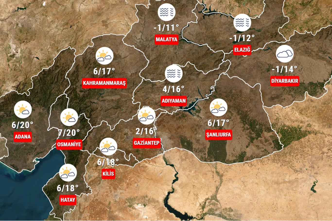 Depremlerin geleceği 11 kentte bugün yağmur beklenmiyor. Diyarbakır'ın çok bulutlu; Malatya, Elazığ ve Adıyaman'ın sisli; diğer illerin az bulutlu geçeceği tahmin ediliyor.