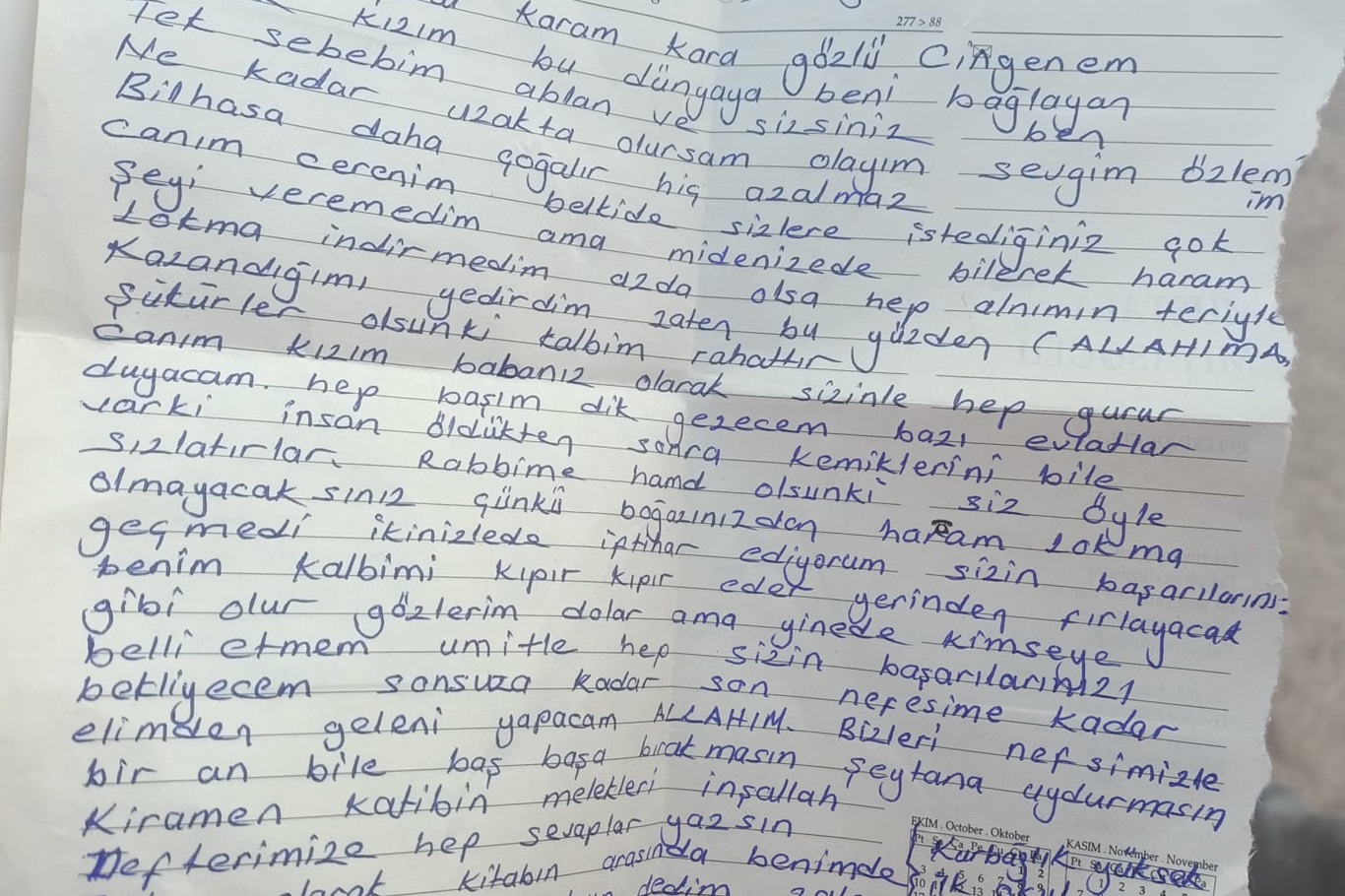 Yazılan mektupta iki faydasından söz eden Selahattin Öztürk'ün, “Canım, çatal karam, kara gözlüm, biricik ocağı. Bu dünyaya beni bağlayan tek sebebim ablan ve sizsiniz. Ben ne kadar uzakta olursam olayım, sevgim, özlemim bilhassa daha çoğalır, hiç azalmaz. Canım Ceren'im belki de sana istediğin çok şeyi veremedim ama midenize de hassas lokma indirmedim. Az da olsa hep alnımın teriyle şarkımı yedirdim. Zaten bu yüzden Allah'ıma şükürler olsun ki kalbimi rahatlatır. Canım evi, babanız olarak sizinle hep gurur duyacağım. Hep başım dik gezeceğim. Bazı evlatlar var ki insan öldükten sonra kemiklerini bile sızlatır. Rabe hamdolsun ki siz öyle olmayacaksınız. Çünkü boğazınızdan haram lokma geçmedi, ikinizle de iftihar ediyorum. Başarılarınız benim kalbimi harekete geçirir. Yerinden fırlayacak gibi olur, gözlerim dolar ama yine de alıcı belli etmemeli. Ümitle hep senin başarılarını bekleyeceğim. Sonsuza kadar, son nefesime kadar geleceği gelecek. Allah'ım bizi nefsimizle bir an bile baş başa bırakmasın, şeytana yürümesin. Kiramen katibin melekleri inşallah defterimize hep sevaplar yazsın. Baban olarak defterinin arasında benim de bir karalı sayfam olsun dedim. Zaten koruduğunuzu ne kadar seveni çingenem” sözleri duygulandırdı.