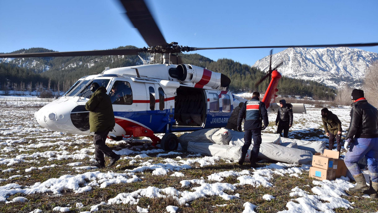Jandarma personelleri sabah saatlerinde Kahramanmaraş Havaalanı'nda çadır, gıda, ilaç ve giyim malzemelerini helikoptere taşıdı. Jandarmaların yardım malzemelerini yerleştirmesinin ardından havalanan helikopter, karla kaplı dağları aşarak köye yakın bir noktaya iniş yaptı.