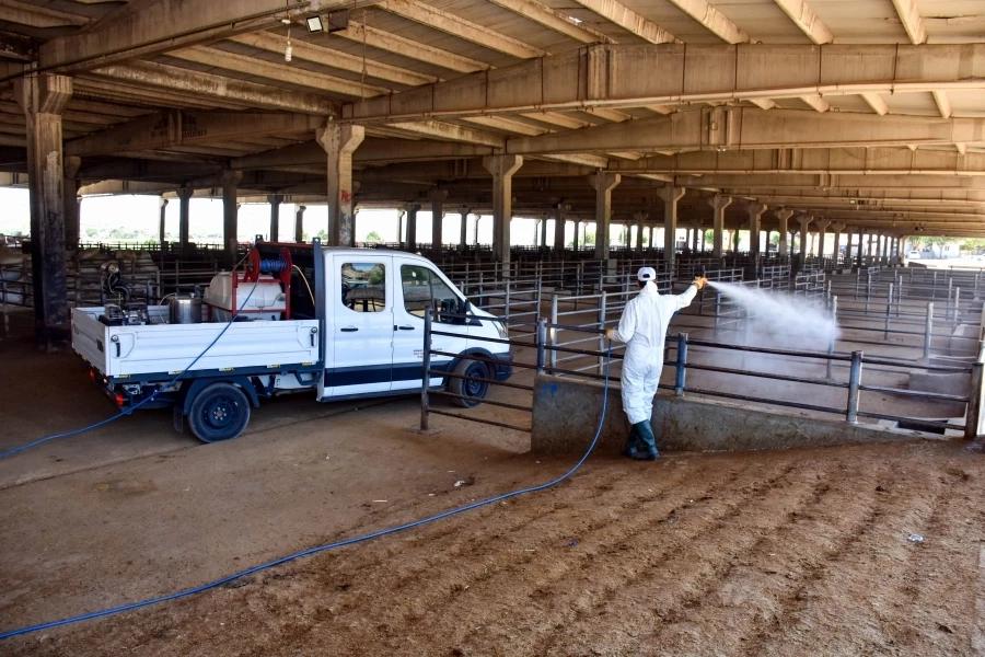 DİYARBAKIR (İGFA) - Diyarbakır Büyükşehir Belediyesi Sağlık İşleri Dairesi Başkanlığı, halkın sağlık güvenliğini korumak için çalışmalarını sürdürüyor. Çalışmalar kapsamında Türkiye genelinde görülen şap hastalığı (SAT-2 serotipi) vakaları nedeniyle Tarım ve Orman Bakanlığının aldığı karar uyarınca ülke genelindeki hayvan pazarları geçici olarak kapatıldı. Hastalığın hayvanları ve halkın sağlığını etkilememesi için tedbir alan Diyarbakır Büyükşehir Belediyesi, Canlı Hayvan Borsası’nı hayvan alımına kapatarak ilaçlama ve dezenfekte çalışması yaptı.