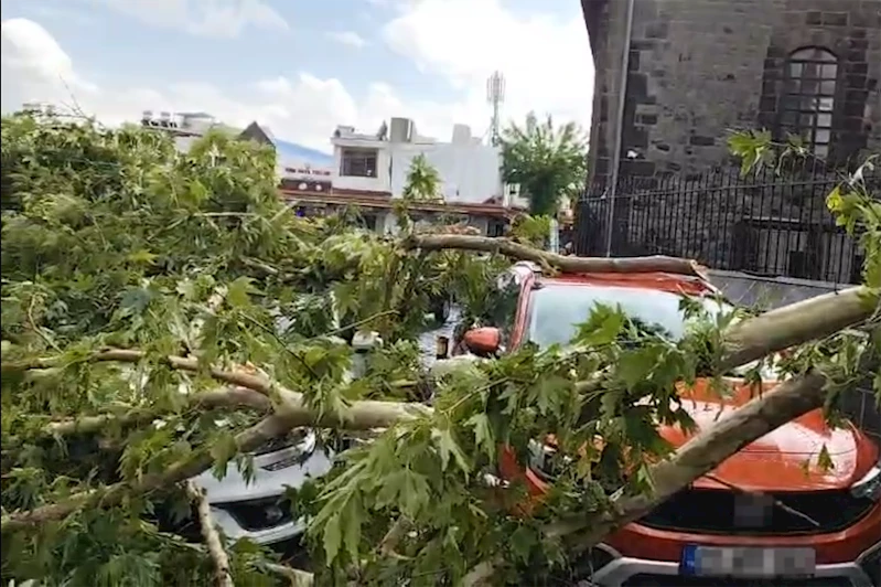 Ulu Cami’nin hemen yanındaki alanda bulunan bir ağaç yağmur ve fırtınanın etkisiyle kırılarak, park halindeki üç aracın üzerine düştü.