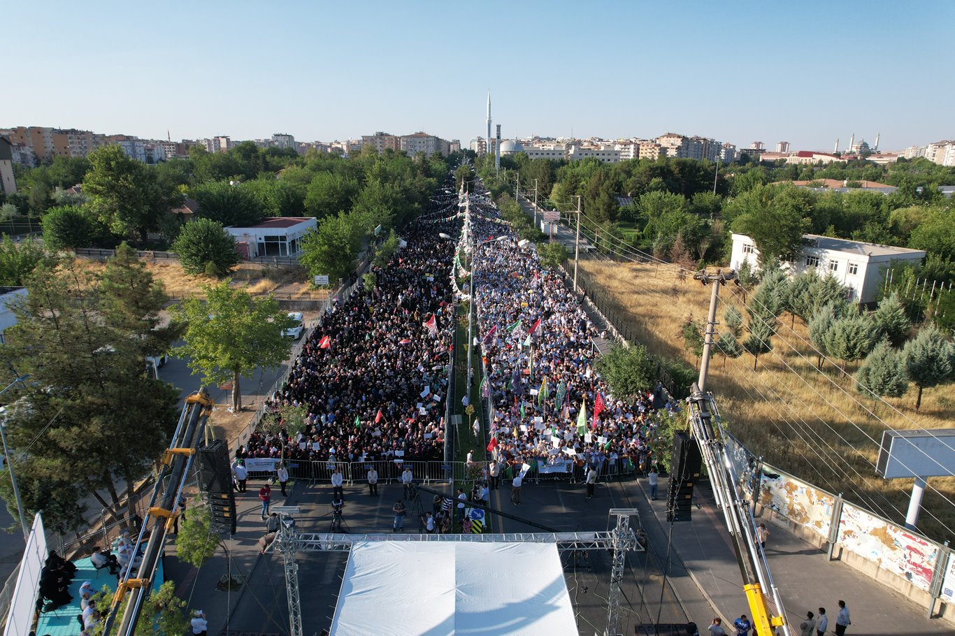 Miting alanına gelen yığınların elinde Kur'an-ı Kerim'in olduğu görüldü. Sık sık tekbirlerin getirildiği mitingde, İslam düşmanları aleyhine pankartlar açıldı. Miting meydanına günleri Adana'da namaz üzerinde şehit edilen HÜDA PAR Adana İl Sekreteri Sacit Pişgin'in posteri asıldı.