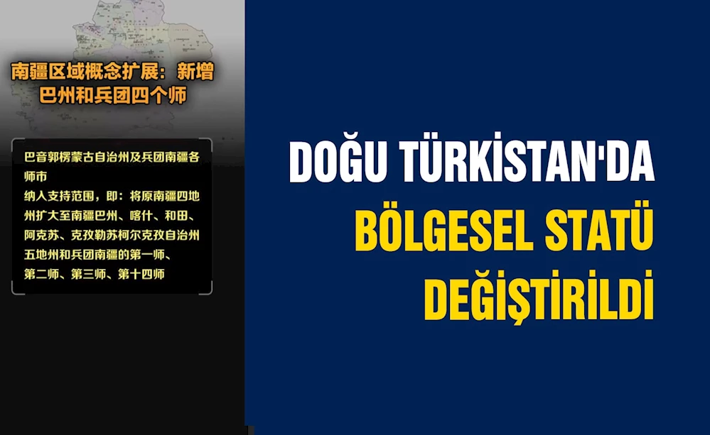 İşgalci Çin, Doğu Türkistan'ı Çinlileştirme hedefine ulaşmak için Doğu Türkistan'ın güney kısmında bölgesel statüleri keyfi değiştirerek güney bölgesinde bir vilayet ve dört askeri tümen peydahladı.