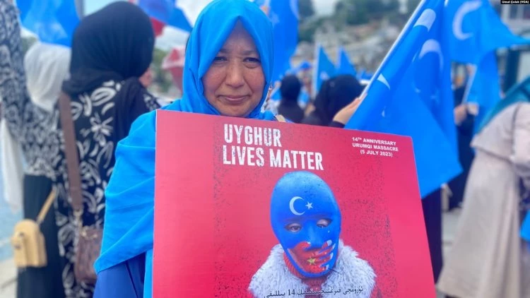 İstanbul'daki Doğu Türkistanlılar, 5 Temmuz 2009 Urumçi olaylarının 14’ncü yıldönümünde ellerindeki pankartlarla Türkiye'den destek istedi