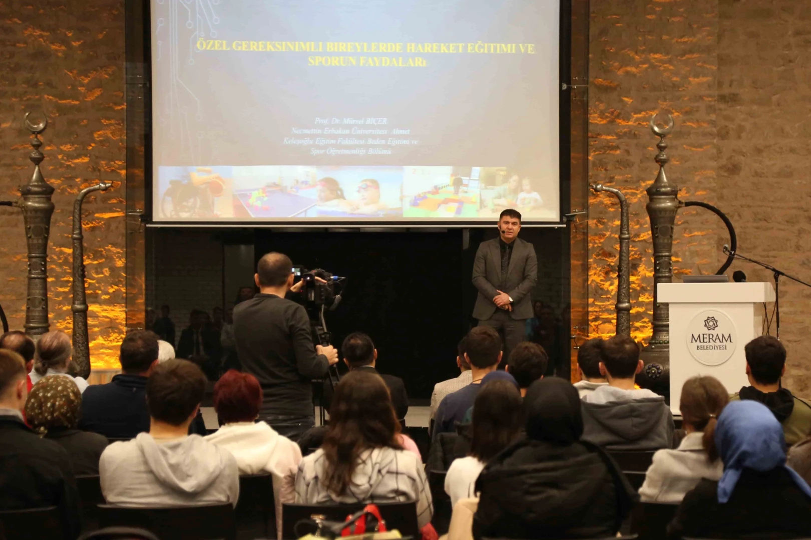 NEÜ Eğitim Fakültesi Dekanı Prof. Dr. Mürsel Biçer, Meram Belediyesi öncülüğünde hayat bulan DOSD Meram’da kasım ayı seminerinin konuğu oldu. Katılımcılara ‘Özel gereksinimli bireylerde hareket eğitimi ve sporun faydaları’nı anlatan Prof. Dr. Biçer, özel gereksinimli olsun olmasın tüm çocukların en temel ihtiyacının ‘spor ve hareket’ olduğunu söyledi.
