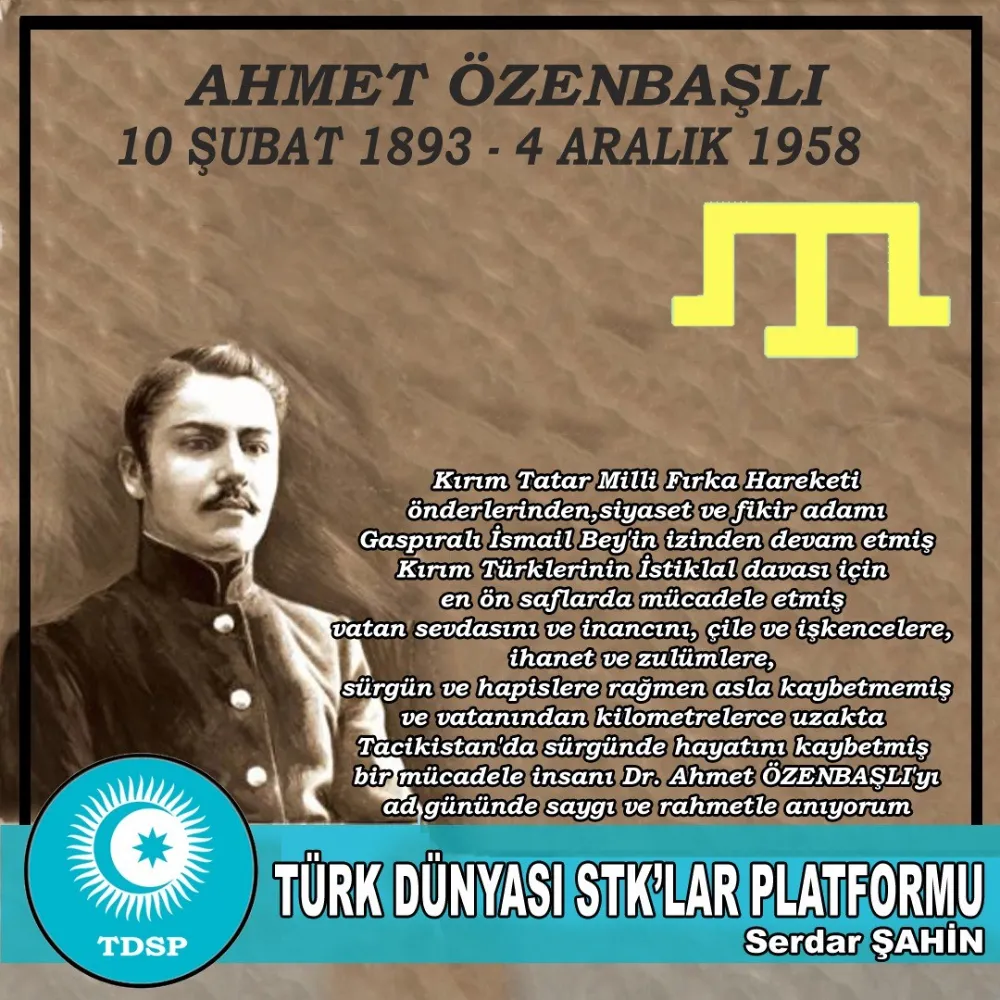 Kırım Tatarı siyaset ve fikir adamı Dr. Ahmet Özenbaşlı 10 Şubat 1893’te Bahçesaray’da doğdu. Babası ressam ve hattat Seyit Abdullah Özenbaşlı, Tercüman Gazetesine şiirler ve makâleler yazan bir sanat adamıydı. İlkokulu bitirdikten sonra Akmescit lisesinde okumaya başlayan Ahmet Özenbaşlı’nın, ailesinin ekonomik durumu babasının hastalığı nedeniyle kötüleşmişti. Yetenekli ve akıllı bir çocuk olan Ahmet’in eğitim masraflarını, Kırımlı hayırseverlerin kurduğu ”Hayriye Cemiyeti” karşıladı. Kendisini okutan hayırseverleri utandırmayan Ahmet Özenbaşlı, 1914 yılında okulundan dereceyle mezun oldu. Ancak başarılı genç, aldığı madalyanın sevincini yaşayamadan, kendisi için ”Hoca” şiirini yazdığı Gaspıralı İsmail Bey’in ölümüyle sarsıldı.