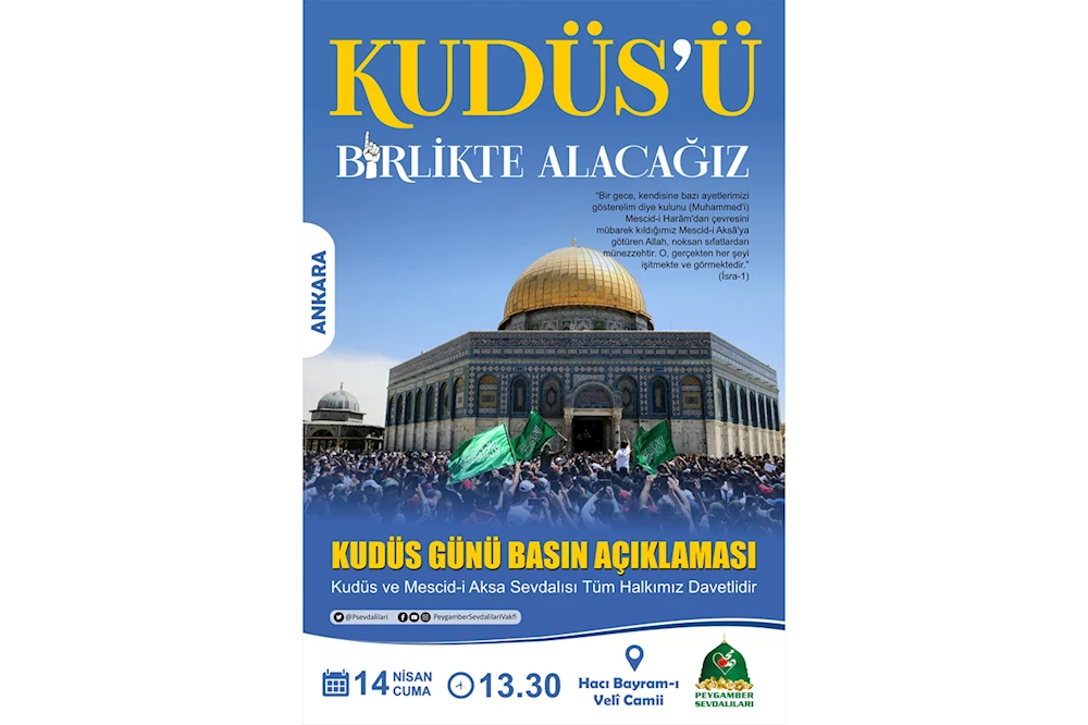 Dünya Müslümanları tarafından 1979 yılından beri Ramazan sonunda son Cuma günü, 'Dünya Kudüs Günü' olarak gösteriliyor. Bugünde düzenlenen çeşitli etkinlik ve programlarla 'Kudüs' ile planlama yaparak, Kudüs'ün Müslümanlar için önemine dikkat çekiliyor. Konuyla ilgili Ankara Peygamber Sevdalıları Dernek Sözcüsü Furkan Karahan, çağrıda bulunarak Kudüs aşığı tüm halkı 14 Nisan (Cuma günü) saat 13.30'da Hacı Bayram Camii avlusunda yapacakları kitlesel açıklamaya tüm Ankaralıları basına davet etti. Karahan, 'Kıymetli Ankara halkı çevresi Ramazan son cuması olan 'Dünya Kudüs Günü'nde Ankara Peygamber Sevdalıları Derneği olarak düzenleyeceğimiz basın açıklamasına onları bekliyoruz. 14 Nisan (Cuma günü) Hacı Bayram Camisinden Cuma namazı çıkışında zulme sessiz kalmamak adına yapılacak olan basın açıklamamıza 7' den 70'e hep beraber tepkimizi ortaya koymaya davet ediyorum.Haydi Ankara halkı zülme sessiz kalma tepkini ortaya koy.' Gülerek kitlesel basın açıklamasına tüm Ankaralılar davet edildi.