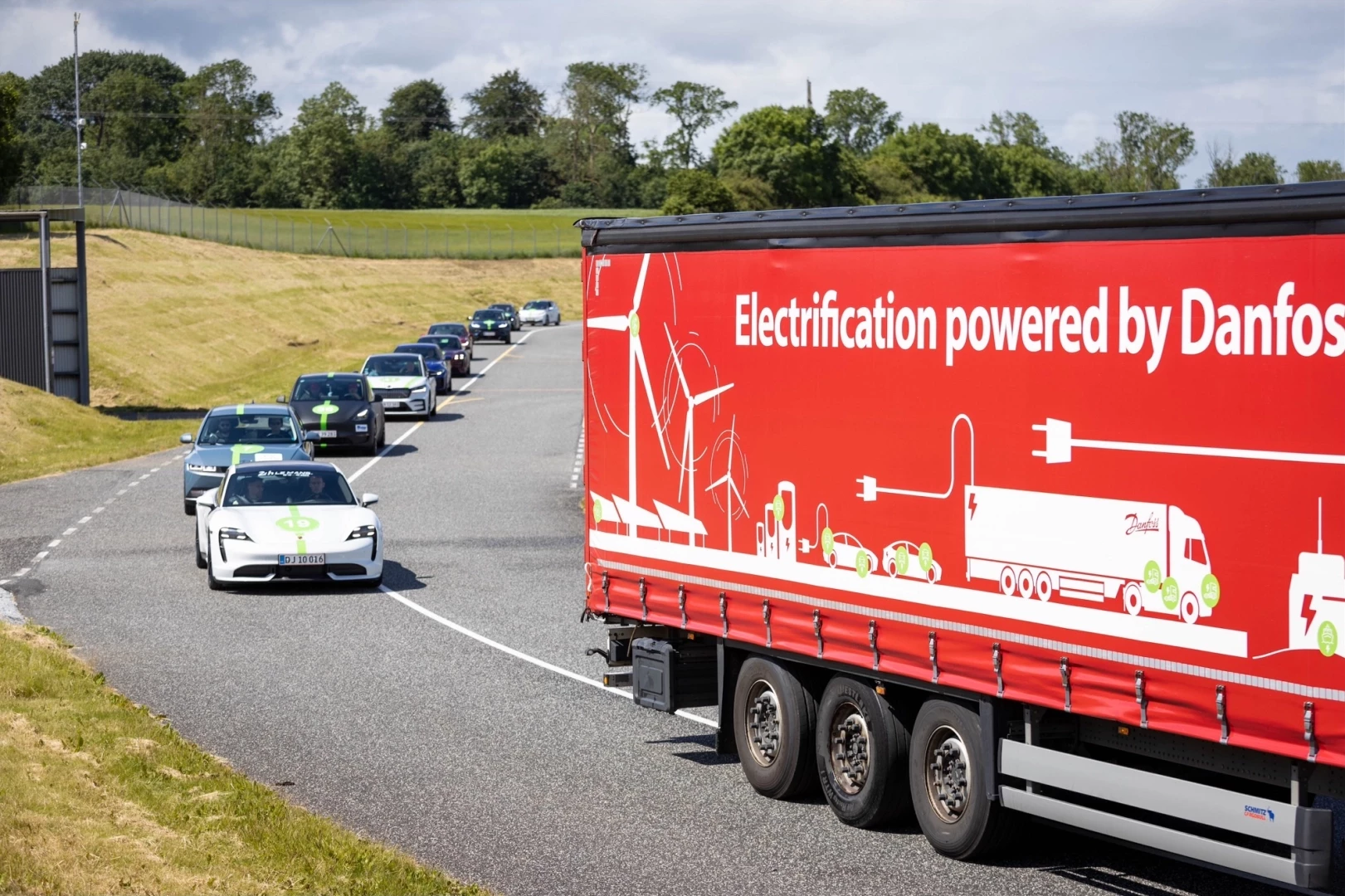 Danfoss'un 20 ton ağırlığında ve 17 metre uzunluğundaki ağır hizmet tipi elektrikli kamyonu, 12-14 Haziran tarihleri arasında "Dünyanın en büyük elektrikli yolculuğu"nda 48 elektrikli binek araca eşlik etti. Elektrikli kamyonlar, Danfoss’un üretim tesislerinde ve lojistik operasyonlarında kargo taşımacılığının daimi bir parçası olarak dikkat çekiyor.