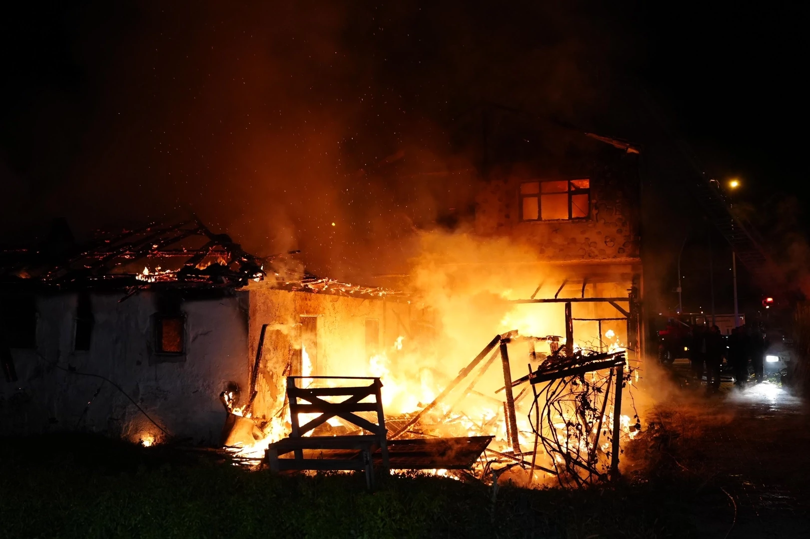 Düzce Konuralp'te bir depoda bilinmeyen nedenle çıkan yangında iki katlı ev küle döndü.