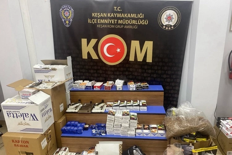 Keşan ilçe merkezinde belirlenen 2 iş yerinde yapılan aramada, 75 bin 550 adet boş makaron, 12 bin 120 adet tütünle doldurulmuş makaron, 186 adet boş sigara kutusu, 1090 adet paketlemede kullanılan kilitli poşet, 3 adet sigara sarma makinesi ve 28 adet yeniden kullanılmak üzere kesilmiş bandrol ele geçirildi.