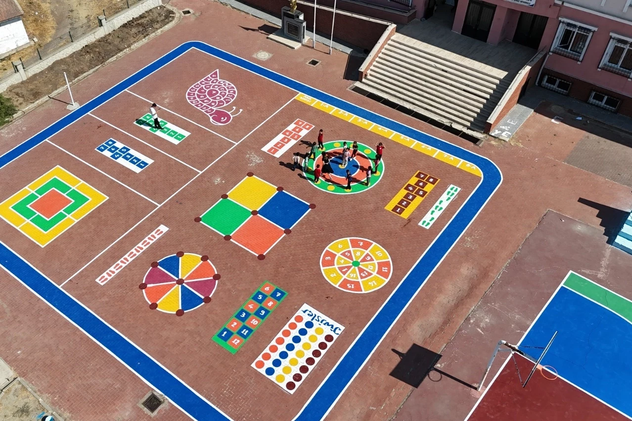 Sadece bununla da kalmayan muhtar, okulun önüne öğrencilerin teneffüslerde ve derslerde keyifli vakit geçirmesi için oyun alanları çizdirerek boyattı.