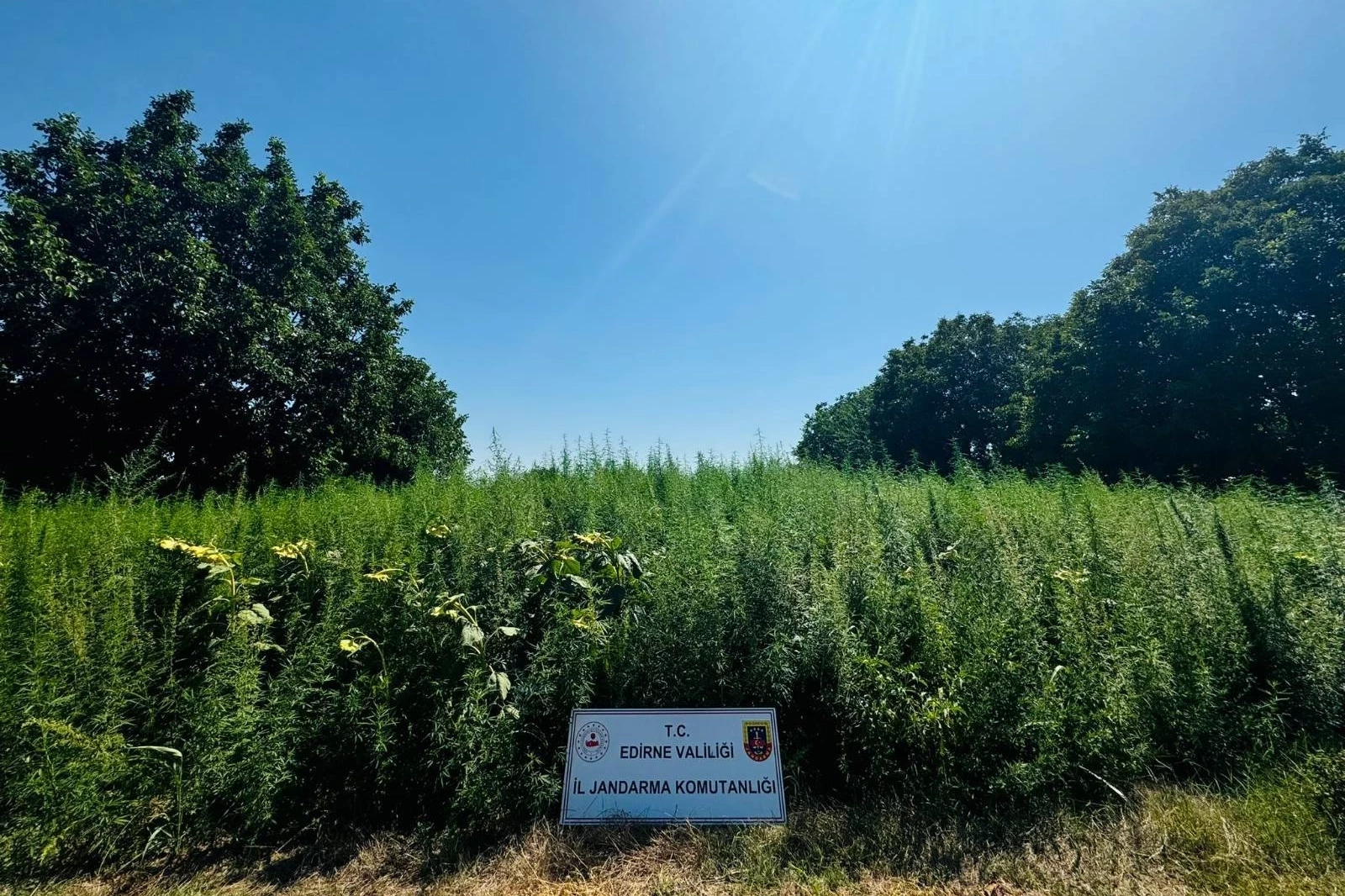 Erdoğan DEMİR / EDİRNE (İGFA) - İl Jandarma Komutanlığı KOM Şube Müdürlüğü ekipleri tarafından uzun süredir takip edilen (M.İ.) isimli şahsın tarlasında yapılan aramada devasa bir kenevir tarlası ortaya çıkarıldı. Ekipler tarafından titizlikle yürütülen operasyonda, yaklaşık 120 bin kök kenevir bitkisi ele geçirilerek kontrollü bir şekilde imha edildi.