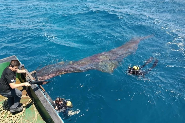 BALIKESİR (İGFA) - Balıkesir Büyükşehir Belediyesi, Çanakkale 18 Mart Üniversitesi Deniz Bilimleri ve Teknolojisi Fakültesi ile Balıkesir İl Tarım ve Orman Müdürlüğü’nün iş birliğiyle 3 yıldır yürütülen 'Hayalet Ağların Temizlenmesi Projesi' kapsamında Ayvalık Cunda Adası mevkiinde tek seferde bin 500 metrekare büyüklüğünde gırgır ağı ve 400 metre uzunluğunda uzatma ağı denizden çıkarıldı. 3 yıl önce başlayan proje kapsamında; Ege ve Marmara’da yaklaşık 50 bin metrekare büyüklüğünde hayalet ağ denizlerden arındırıldı. Balıkesir Büyükşehir Belediye Başkanı Yücel Yılmaz; denizlerde biyolojik çeşitliliğin artırılması, deniz ve kıyıların kirlenmesinin önlemesi amacıyla saatlerce denizin altına hayalet ağ arayan ‘Hayalet Ağ Avcılarını’ ziyaret etti.