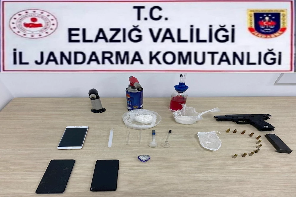 Elazığ Jandarma ekipleri tarafından yürütülen  takip sonucu Elazığ Merkez Güneykent Mahallesi'nde ikamet eden NK'nin narkotik  madde ticareti yaptığı bilgisi üzerine operasyon yapıldı. Evde yapılan aramada 120 gram metamfetamin, 1 adet ruhsatsız 9 mm çapında tabanca, 11 adet fişek ve iç gözünde kullanılan aparat ele geçirildi. NK adlı şahıs ekipler gözaltına alındı. Adli çalıştırmanın devam ettiği öğrenildi.