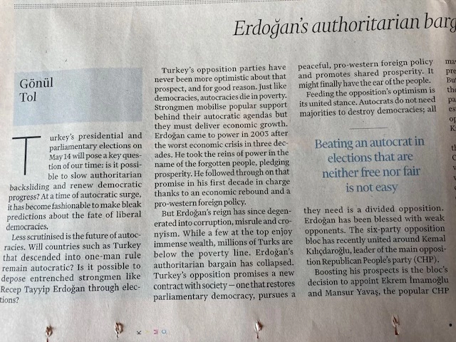 Financial Times’da, Gönül Tol imzası ile yayınlanan yazı Türkiye seçimlerini konu alıyor. Makalenin orijinalinden bir özeti aşağıda bulabilirsiniz.