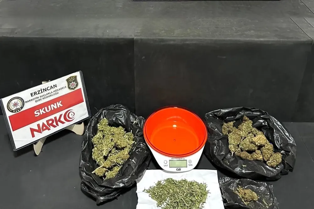 Erzincan Emniyet Müdürlüğü Narkotik Suçlarla Mücadele Şube Müdürlüğü ekiplerince uyuşturucu madde kullanımının ve satışının engellenmesine yönelik yapılan operasyonda, S.A. isimli şüpheli şahsın ikamet ve işyeri aramasında; 4 parça halinde toplamda 169,86 gram skunk maddesi ve hassas terazi ele geçirildi.