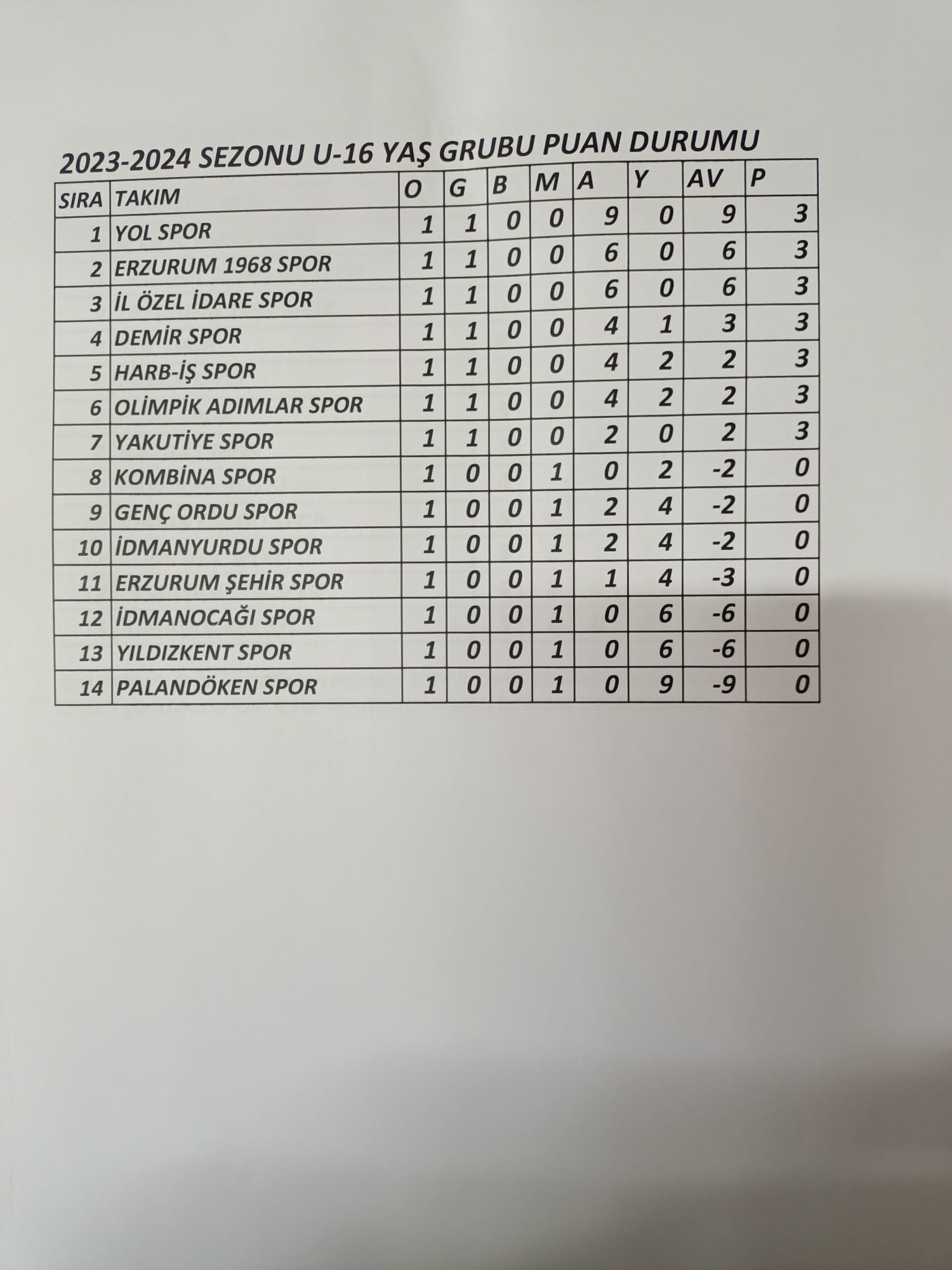 U-16 YAŞ GRUBU PUAN DURUMU...