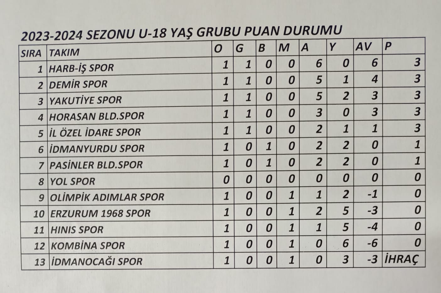 U-18 Yaş Grubu ilk hafta maç sonuçları ve puan durumu