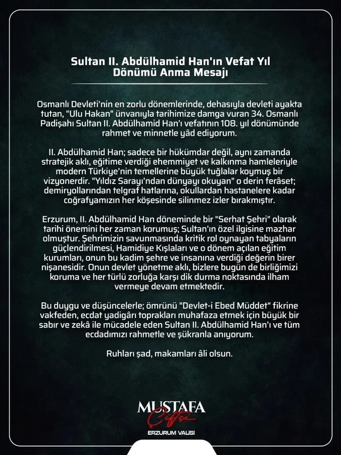 Erzurum Valisi Çiftçi'den Vali olarak son mesaj... Sultan II. Abdülhamit Han’ın vefat yıl dönümünde; rahmet ve hürmetle anıyoruz.