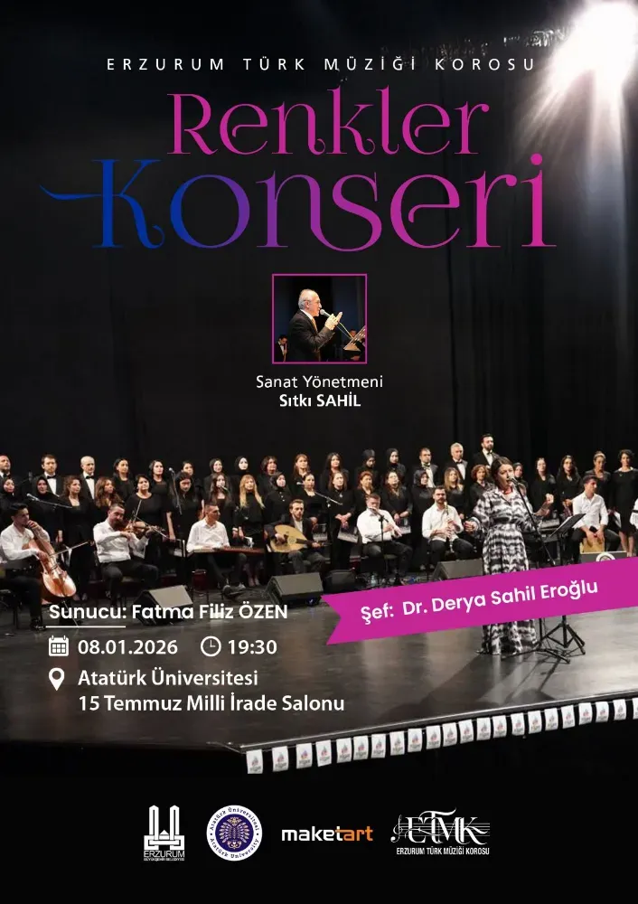 Erzurum’un sanata değer veren sivil toplum hareketlerinden biri olan Erzurum Türk Müziği Korosu, yeni yılın ilk büyük sanat etkinliğine imza atıyor. Atatürk Üniversitesi, Erzurum Büyükşehir Belediyesi Kültür Daire Başkanlığı ve MaketArt İnşaat’ın katkılarıyla düzenlenecek olan "Renkler Konseri", 8 Ocak 2026 Perşembe günü saat 19.30’da gerçekleşecek.