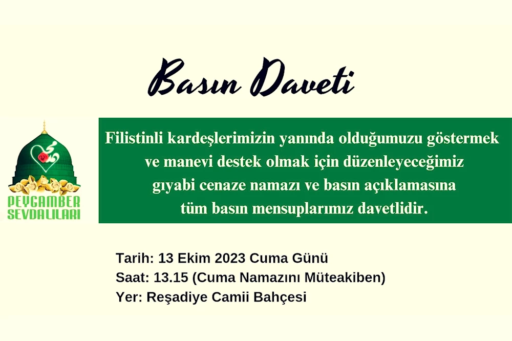 İşgalci siyonist rejimin bombardımanı altında olan Gazze'de yaşanan vahşete dikkat çekmek, Filistinli kardeşlerinin yanında olduklarını göstermek için Peygamber Sevdalıları Eskişehir Derneği, Reşadiye Camii'nde kılınacak Cuma namazı sonrası gıyabi cenaze namazı kılınacağını açıkladı. Gıyabi cenaze namazının ardından cami bahçesinde bir basın açıklamasının düzenleneceğini bildiren Peygamber Sevdalıları, 'Filistinli kardeşlerimizin yanında olduğumuzu göstermek ve manevi destek olmak için düzenleyeceğimiz gıyabi cenaze namazı ve basın açıklamasına tüm basın mensupları ve vicdan sahibi halkımız davetlidir' ifadelerini kullandı