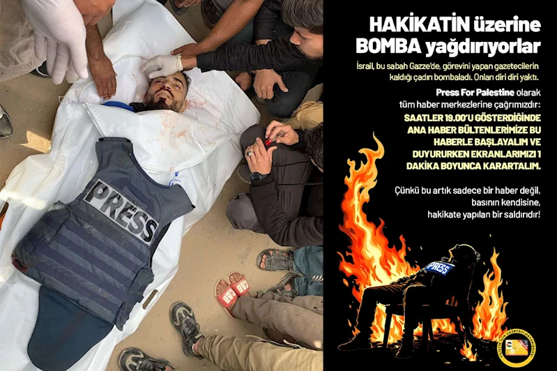 Farklı dillerde hazırlanan görsellerde dünya medyasına yapılan çağrıda, "Hakikatin Üzerine Bomba Yağdırıyorlar! İsrail, bu sabah Gazze’de, görevini yapan gazetecilerin kaldığı çadırı bombalayarak onları diri diri yaktı. Dünyada ilk kez gazeteciler bu şekilde topluca katledildi. İsrail, sadece insanları değil, gerçeği de yok etmeye çalışıyor. Press For Palestine olarak tüm haber merkezlerine çağrımızdır! Saatler 19.00’u gösterdiğinde ana haber bültenlerimize bu haberle başlayalım ve duyururken ekranlarımızı 1 dakika boyunca karartalım. Çünkü bu artık sadece bir haber değil basının kendisine, hakikate yapılan bir saldırıdır." ifadelerine yer verildi. (İLKHA)