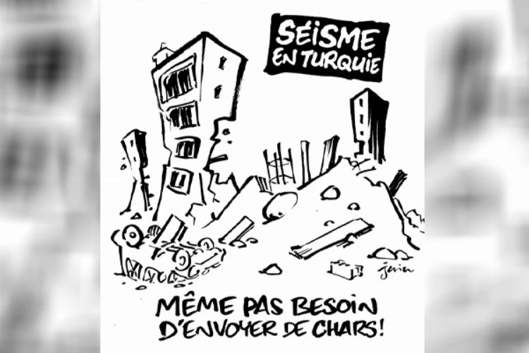Hz. Muhammed'e hakaret içerikli karikatürleriyle gündeme gelen Charlie Hebdo dergisi, Türkiye'deki depremle dalga geçti.  Hz. Muhammed'e hakaret içerikli karikatürleriyle gündeme gelen Charlie Hebdo dergisi, Türkiye'deki depremle alay etti. Charlie Hebdo'da yayınlanan karikatürde, Türkiye'deki depremden bahsedilerek 'tank göndermeye bile gerek yok' ifadesine yer verildi. Fransız derginin Türkiye'deki depremde oluşan tahribatla alay etmesi tepki topladı. Mepa News'te yer alan habere göre, dergi daha önce İtalya'da yaşanan depremle de alay etmişti. Charlie Hebdo, Hz. Muhammed'e hakaret ettiği karikatürler sebebiyle 2015 yılında silahlı saldırıya uğramıştı.