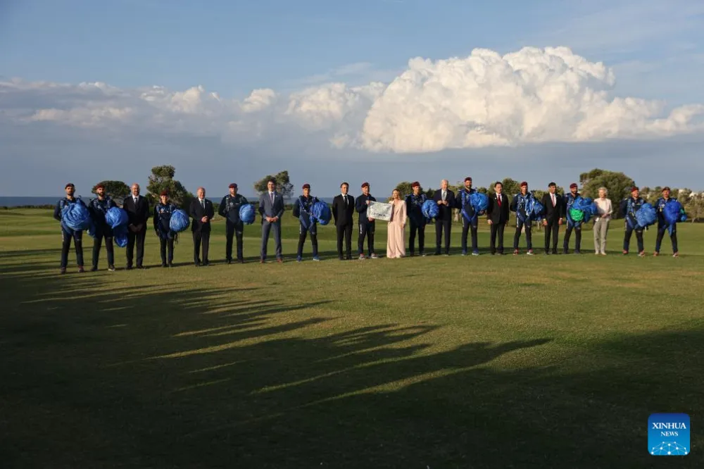 G7 liderleri, 13 Haziran 2024'te İtalya'nın Apulia Bölgesi'ndeki Fasano kasabası yakınlarındaki Borgo Egnazia'da paraşütle atlama bayrağı sanatçılarıyla grup fotoğrafı için poz veriyor. Üç gün süren 2024 Yediler Grubu (G7) zirvesi Perşembe günü başladı Güney İtalya'nın Apulia bölgesindeki Fasano kasabası yakınlarındaki bir tatil beldesi olan Borgo Egnazia'da protestolar sürüyor. (Xinhua/Li Jing)
