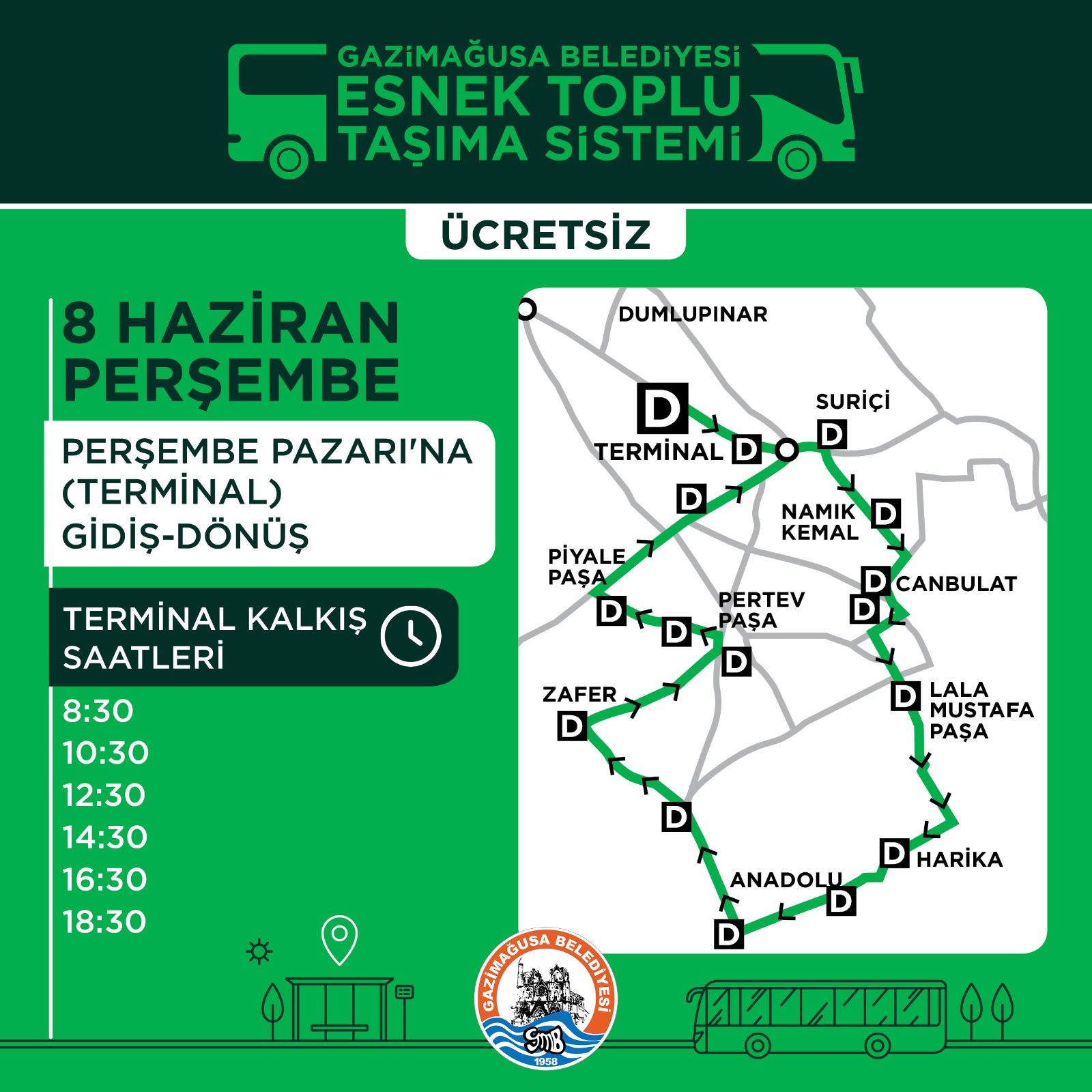 Başlangıç noktası Terminalin olacağı toplu taşıma seferleri, Namık Kemal Mahallesi Belediye önü, Canbulat Mahallesi Canbulat Özgürlük Ortaokulu önü, Lala Mustafa Paşa Mahallesi Durağı (Maksim) güzergahını takip ederek, Harika Mahallesi, Anadolu Mahallesi, Zafer Mahallesi, Pertev Paşa Mahallesi, Piyale Paşa Mahallesi’nden 15 Ağustos Bulvarı’na geçiş (Larnaka Yolu), Anıt Çemberi’nden Terminal istikametine dönüş olarak hizmet verecek.