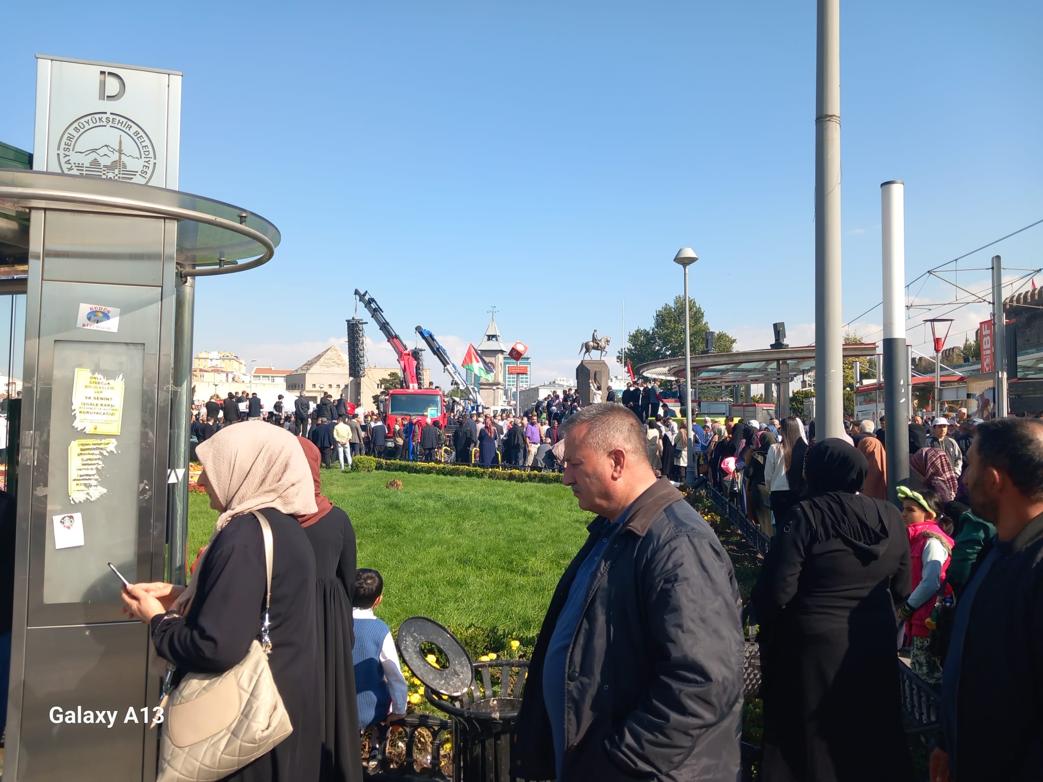 Gazze için gıyabi cenaze namazı… 20 Ekim Cuma namazının ardından Kayseri Cumhuriyet meydanında Gazze'de şehit olan halk için gıyaben cenaze namazı kılındı. Vusale Ali TUM1HABER/Kayseri Namaz için meydan boyu sığmayan halk kütlesi Tramvay hattı ve çarşı girişi boyunca saf tutarak genci ihtiyarı ile cenaze namazına durdular.  Namaz sonrasında müezzin terör eylemi yapanlara, sivil halka katılım yapanlara lanet yağdırarak Allahtan bu kanlı eylemlerin son bulması için çözüm göndermesi üzerine dua ettiler. Filistin bayrağı altında müezzini dinleyen halk kesimi ellerini açarak dualara eşlik ettiler.