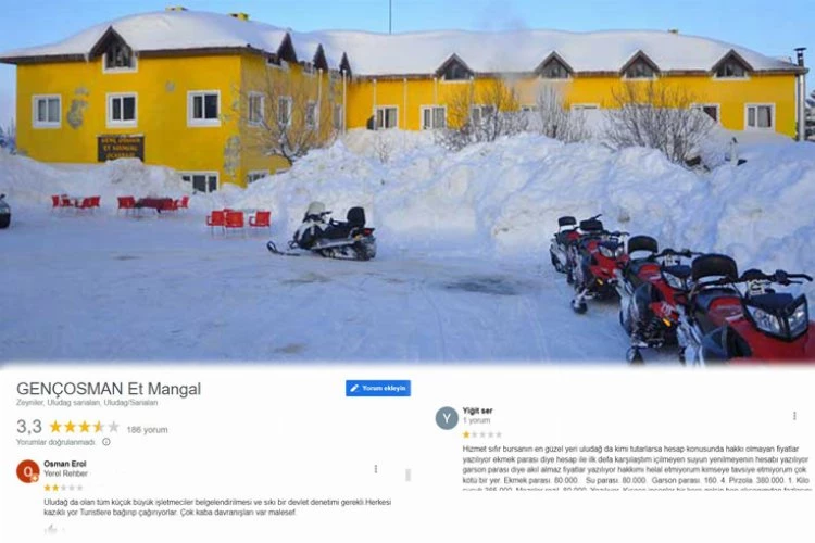 Osman Erol isimli vatandaş ise, Gençosman Et Mangal’ın turistlere bağırıp çağırdığını dile getirerek, “Uludağ’da olan tüm küçük büyük işletmeciler belgelendirilmesi ve sıkı bir devlet denetimi gerekli. Herkesi kazıklıyor. Turistlere bağırıp çağırıyorlar. Çok kaba davranışları var maalesef” diye tepki gösterdi.
