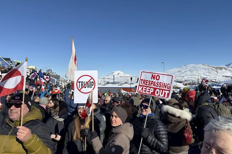 Trump'ın Grönland'ın egemenliğini konu alan söylemlerine tepki göstermek için başkent Nuuk'un merkezinde toplanan protestocular, ellerinde "Ülkemizi ele geçiremezsiniz", "Burada hoş karşılanmıyorsunuz" ve "Tehditleri durdurun" yazılı pankartlar taşıyarak, ABD Konsolosluk binasına yürüdü.