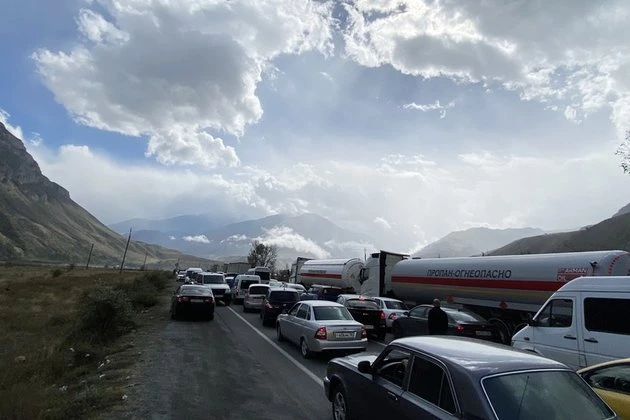 Gürcistan'dan Rusya'ya geçmek için kuyruğa giren arabalar