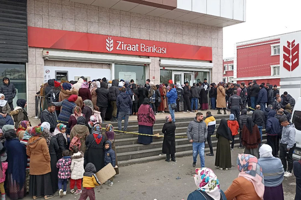 Kahramanmaraş merkezinden meydana gelen 7,7 ve 7,6 büyüklüğündeki iki depremin sonraki konutları hasar gören hane sahiplerine yönelik 10 bin TL'ye giden Hane Başı Destek Ödemeleri yapılmaya başlanınca Ziraat Bankası şubeleri ön yapılandırması oluştu.