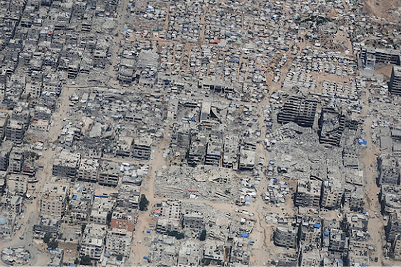 Gazze kentinde ise görüntüler, büyük ölçüde hasar almış binaları ve işgal bombardımanı nedeniyle zorla göç etmek zorunda kalan Filistinlilerin barındığı yüzlerce çadırı gösteriyor.